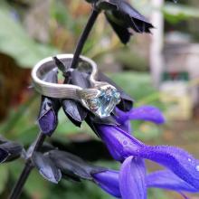 Power Flowerring gemaakt van Mokume-gane met 14kt. palladium witgoud en zilver met een aquamarijn in een witgouden zetting.