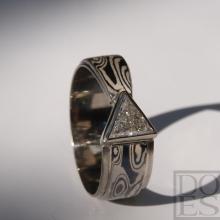 Trouwringen gemaakt van Mokume-gane 18kt.geelgoud, 14kt. roodgoud en zilver. Aan het oog van Isis hangt een diamant (met certificaat) van 0,43ct als traan van geluk. De damesring Isis (4984,- euro) weegt 12,6 gram, de herenring Osiris (2983,50 euro) weegt 11,7 gram.